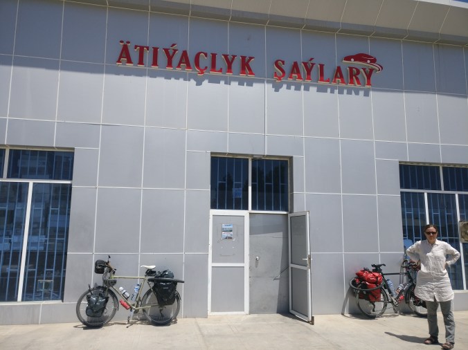 11H on sort des douanes après 3h avec notre précieux tampon. Première victoire. Il commence déjà à faire très chaud. Direction le village frontalier de Serakhs. On cherche le « magasin de peinture » qui semble t-il permet de changer des dollars en manat (monnaie locale). On attaque les courses pour la journée de vélo et l’éventuelle nuit dans le désert. La première ville est à 100km. Nos vélos s’alourdissent de 22L d’eau.